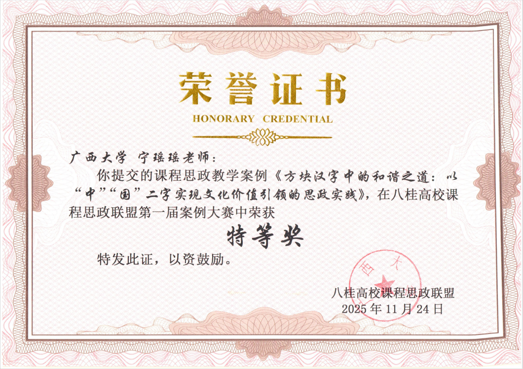 同时荣膺特等奖的案例还有宁瑶瑶老师的《方块汉字中的和谐之道:以“中”“国”二字实现文化价值引领的思政实践》。该案例独具匠心地从“中”“国”两个基础汉字的字形、字源与字义解析入手,深刻挖掘了汉字形体结构中所蕴含的平衡、稳定、包容、集体至上等哲学智慧与文化理念,生动揭示了汉字作为中华文明载体所内蕴的“和谐之道”,实现了语言学知识传授与民族文化认同塑造的同构。