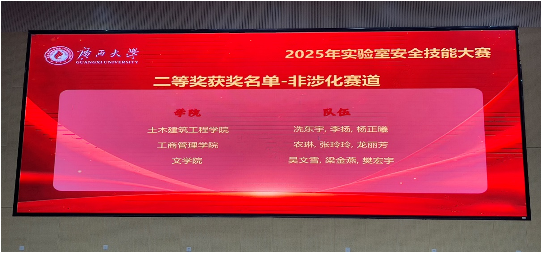 12月5日,广西大学2025年实验室安全文化月闭幕式顺利举行,现场公布了“2025年实验室安全技能大赛”获奖名单。我院吴文雪、梁金燕、樊宏宇三名本科生组成的参赛队伍,荣获非涉化赛道二等奖。