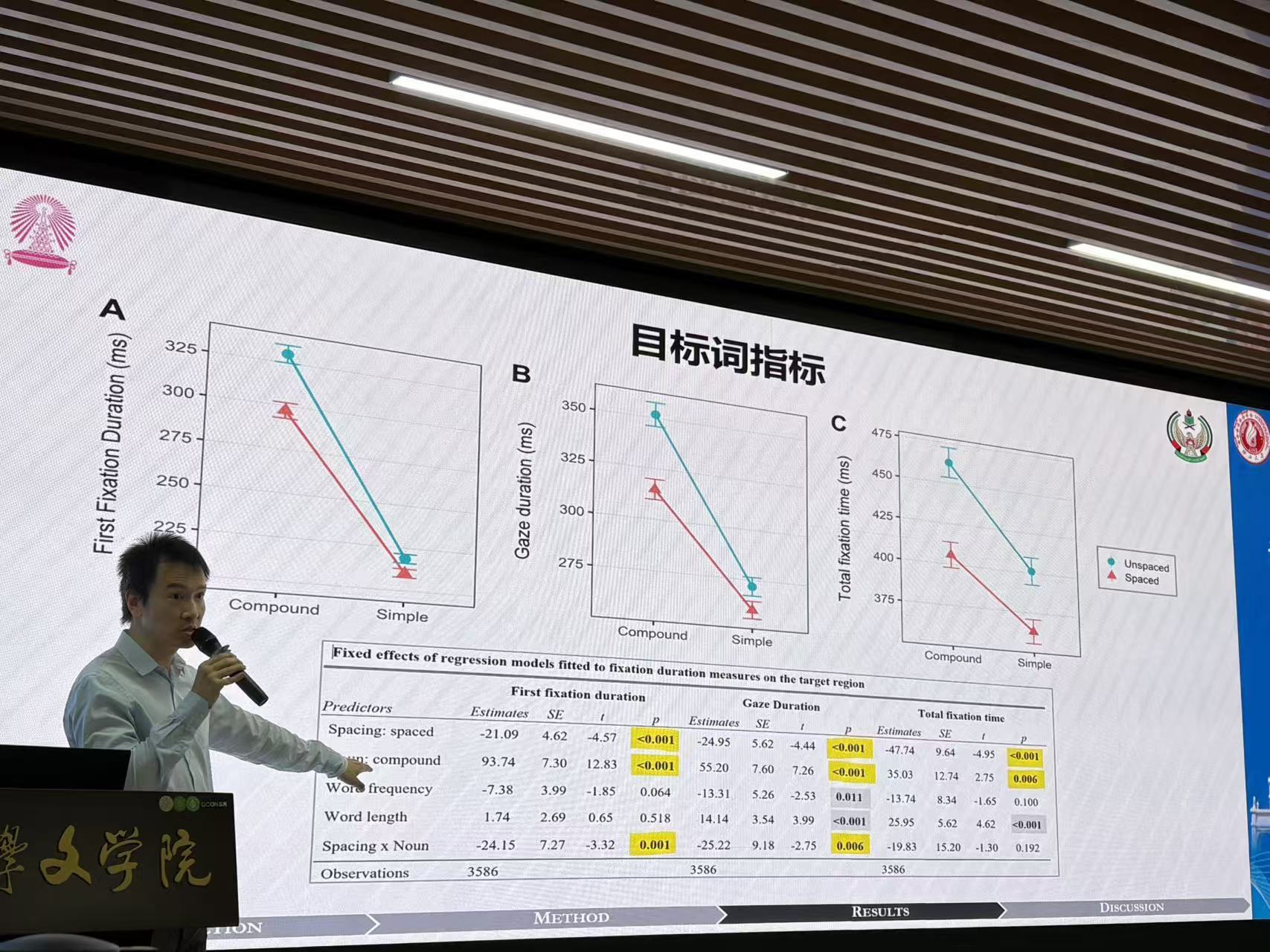 在报告中,梁子祥教授首先梳理了阅读活动的多模态加工层次与视觉识别机制,并依次介绍了E-Z阅读模型、词间空格效应和泰语书写系统的特点。讲座的核心部分聚焦于泰语阅读研究,梁子祥教授及其团队通过眼动实验对比了不同空格条件下单词与复合词的阅读表现。结果发现,词间空格对词汇识别的促进作用显著受词汇形态结构调节。这一发现不仅深化了研究者对无空格语言阅读机制的理解,也为跨语言书写系统的词汇加工研究提供了重要实证依据。