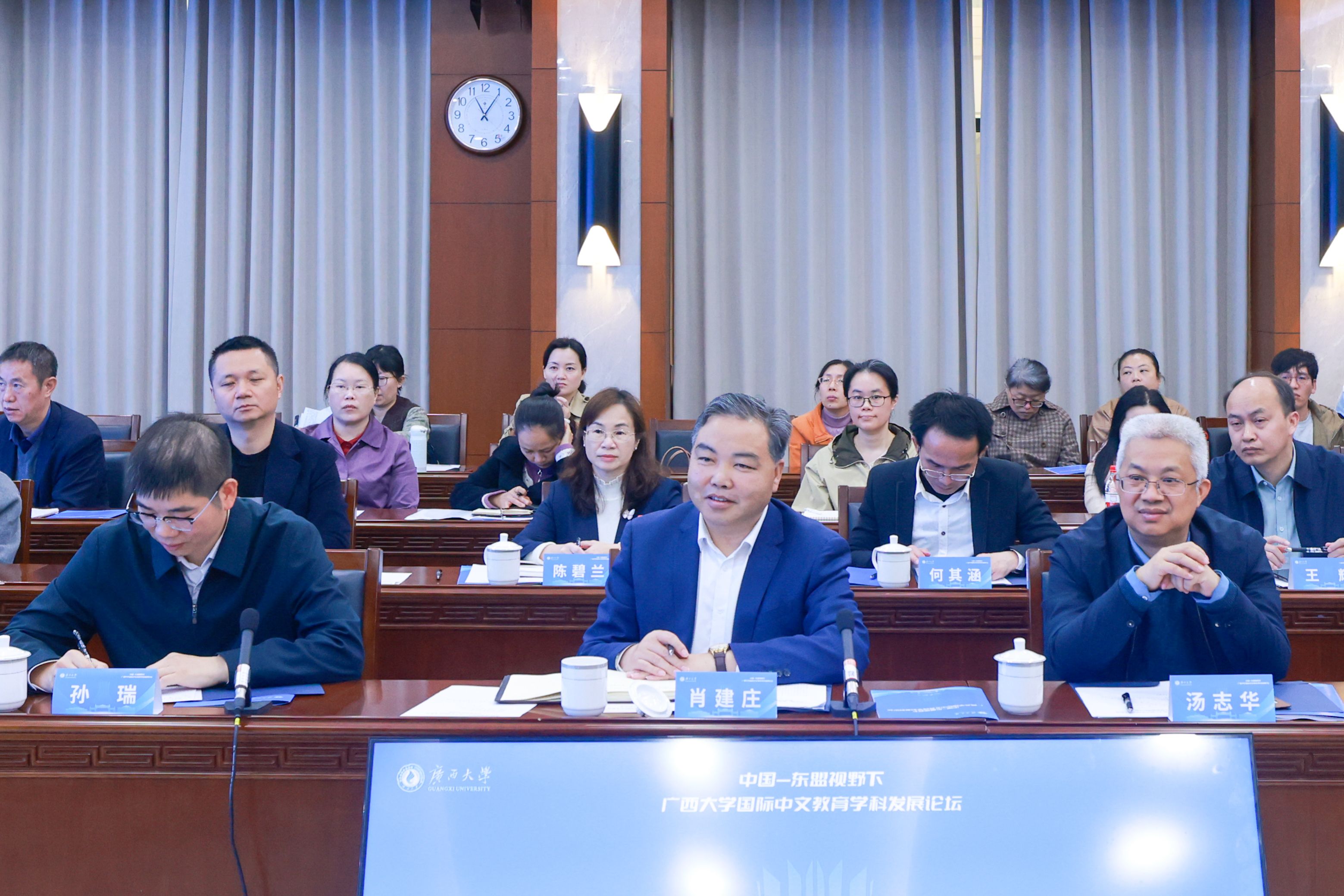 12月17日,中国—东盟视野下广西大学国际中文教育学科发展论坛在君武馆第二会议室举行。全国国际中文教育专业学位研究生教育指导委员会副主任委员、中国国际中文教育基金会副理事长刘利等23位教指委专家到校考察指导。校党委副书记、校长肖建庄出席论坛并致辞,校党委副书记汤志华陪同调研并作专项介绍,校党委常委、宣传部部长、文学院教授孙瑞作专题汇报。学院党委书记银健全程陪同调研并出席论坛,谢晓明教授主持论坛。