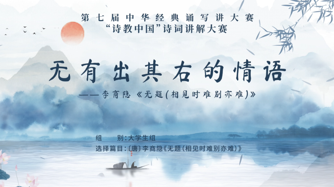 据悉,中华经典诵写讲大赛是由教育部办公厅主办的全国性赛事活动。大赛旨在服务教育强国、文化强国建设,加大国家通用语言文字推广力度,传承发展中华优秀语言文化,目前已成功举办七届。其中,“诗教中国”诗词讲解大赛要求参赛学生广泛阅读经典书籍,结合个人经历与感受,对诗词作品进行解读,阐述诗词的意义与价值。