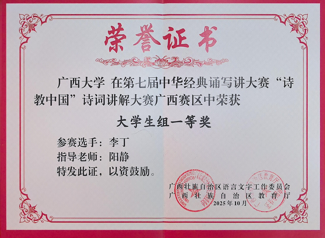近日,第七届中华经典诵写讲“诗教中国”诗词讲解大赛广西赛区颁发获奖证书。阳静教授指导的2023级中国语言文学专业硕士研究生李丁代表学校参赛,凭借其作品《无有出其右的情语——李商隐〈无题(相见时难别亦难)〉》荣获一等奖。