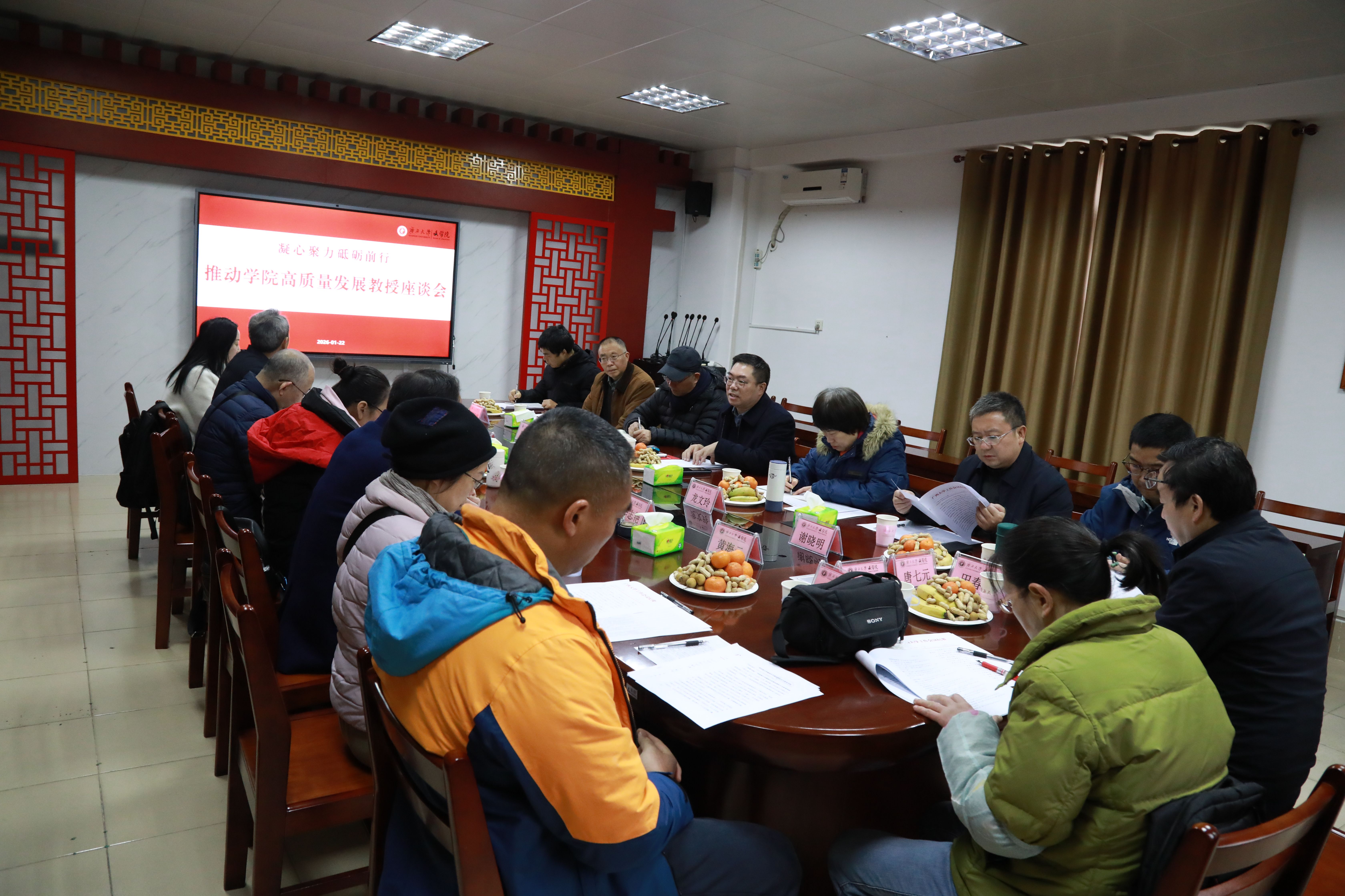 交流研讨环节,教授们畅所欲言、各抒己见,围绕“十五五”规划指标科学性、广西大学人文社科高质量发展任务落地、博士点申报方向遴选、学院90周年工作等议题深入研讨,积极为学院发展建言献策。如进一步深度挖掘校友资源,通过邀请知名校友讲学、设立专项奖学金等举措赋能学生成长;优化科研经费结构,主动对接国家及区域战略需求,积极拓展横向科研经费渠道;创新人才引育留用机制,及时补充重点专业师资力量;立足区位优势,推进面向东盟的教材编写与标准化课程体系建设,打造特色学科品牌;整合校内外优质资源,建设中华文化传承实训基地,持续完善留学生教学与管理服务体系。此外,教授们还就学科交叉融合、科研项目精准指导、考核激励机制优化等方面提出了具体可行的意见。