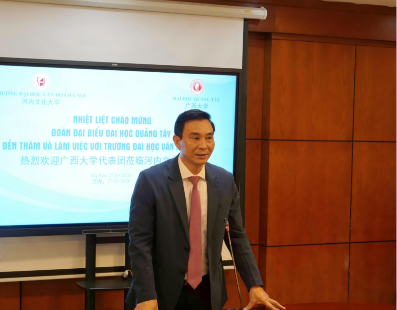 河内文化大学党委书记、校长丁公俊对广西大学代表团的到访表示热烈欢迎。他详细介绍了该校的办学特色、学科布局及近年来的发展成果,并表达了与广西大学文学院开展全方位合作的强烈意愿,期待未来能在师生互访、联合培养及科研协作等领域取得实质性进展。